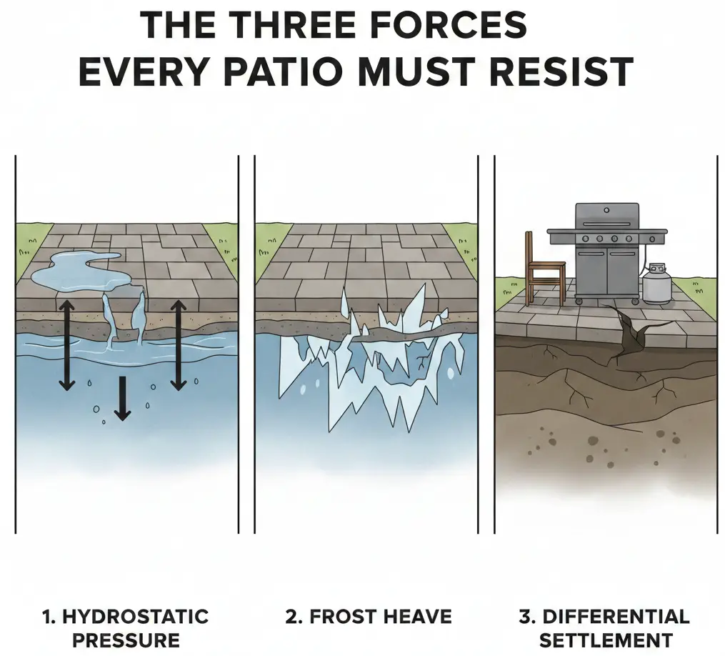 Well, here’s the uncomfortable truth, the visible surface is rarely the problem. It’s the system beneath it. Most patio failures aren’t aesthetic failures. They’re mechanical failures. Hydraulic failures. Compaction failures. Drainage failures.