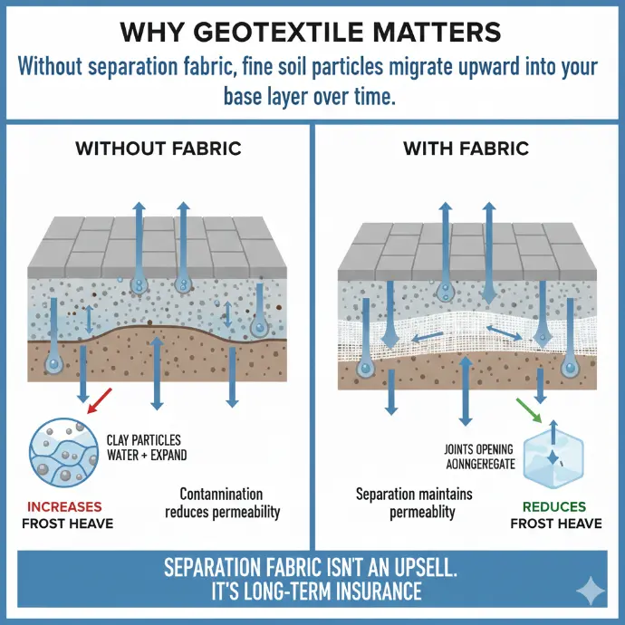 1. Without separation fabric, fine soil particles migrate upward into your base layer over time.