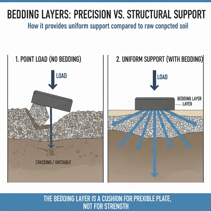 Bedding material is often misunderstood. It does not provide structural strength. It provides surface precision. Its purpose: