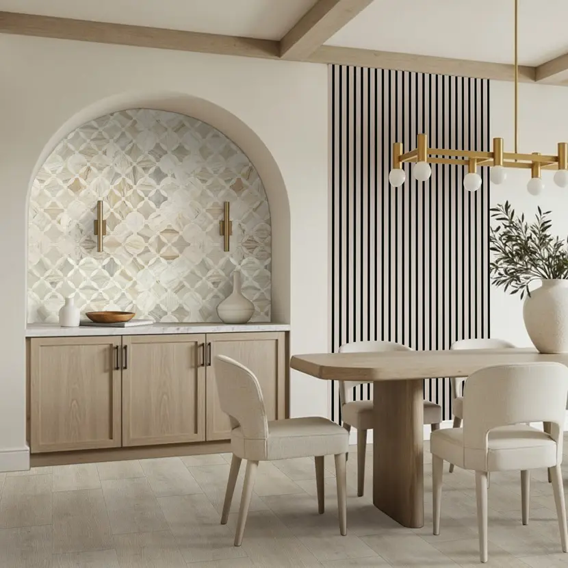 The Look: This trend is all about depth. It’s Umber Acoustic Wood Slat Panels paired with rich brown wood-look porcelain. It’s a "Moody Elegance" that feels like a high-end mountain lodge or a sophisticated urban den.